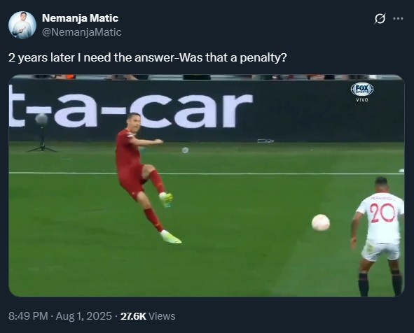 2023年歐聯(lián)杯決賽羅馬對陣塞維利亞,當時馬蒂奇為羅馬效力。兩隊常規(guī)時間1-1戰(zhàn)平,最終塞維利亞點球擊敗紅狼軍團。