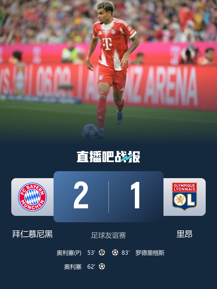 8月2日訊 北京時間8月2日晚21時30分,2025年足球友誼賽在安聯(lián)球場展開角逐,拜仁慕尼黑主場迎戰(zhàn)里昂。上半場雙方比賽場面沉悶,下半場迪亞斯首秀7分鐘造點,奧利塞梅開二度,羅德里格斯扳回一城,基米希遭馬蒂奇肘擊。最終拜仁主場2-1戰(zhàn)勝里昂,拜仁取得季前賽開門紅。