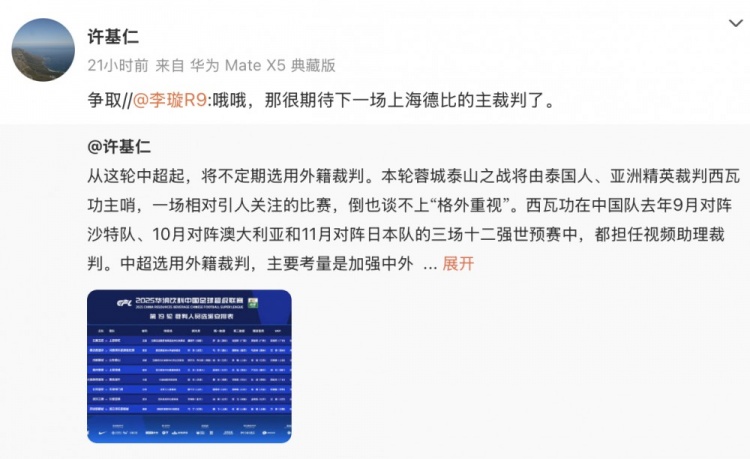 8月3日訊 對于網(wǎng)絡(luò)上呼吁下一輪中超上海德比邀請洋哨的聲音,足協(xié)副主席許基仁在個(gè)人社媒予以了回應(yīng)。