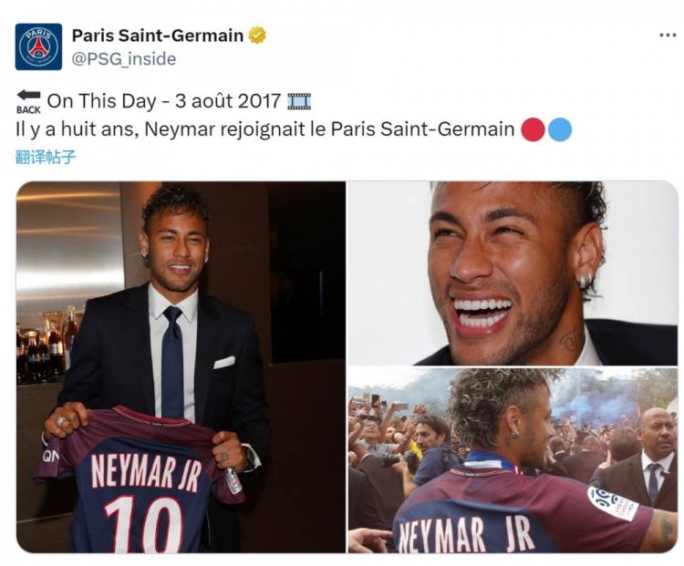 2017年8月3日,內(nèi)馬爾以2.22億歐元轉(zhuǎn)會費(fèi)從巴薩加盟巴黎,巴黎官方社媒曬出內(nèi)馬爾加盟時(shí)的照片,回顧那個(gè)特別的日子。