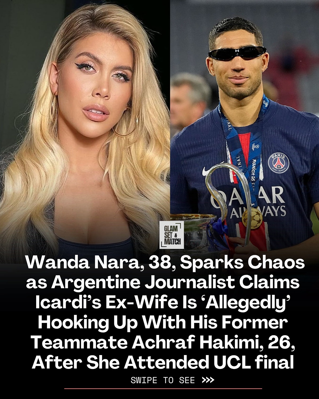 06月02日訊 據粉絲超過300萬的阿根廷八卦記者Yani Latorre透露,旺達近期勾搭上了巴黎邊后衛(wèi)阿什拉夫,現場觀看歐冠決賽并參加了巴黎內部的慶?;顒?。