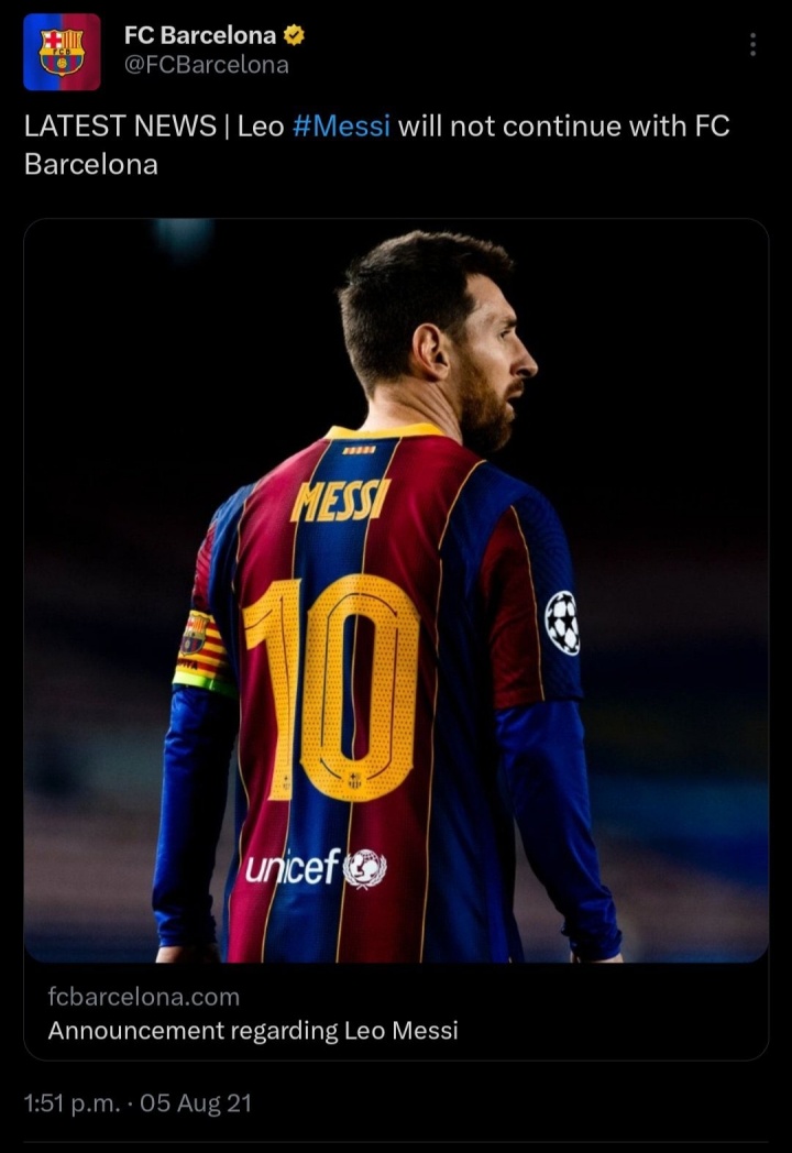 西班牙當(dāng)?shù)貢r(shí)間2021年8月5日,巴塞羅那俱樂部發(fā)布官方公告,宣布無法與梅西完成續(xù)約。如今距離這則公告發(fā)布已經(jīng)過去四年。