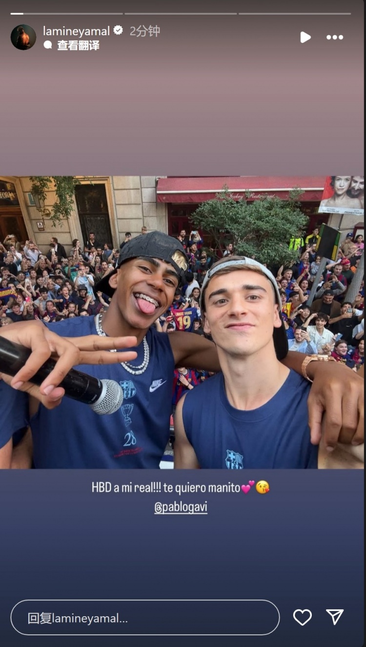 8月5日訊 亞馬爾更新社媒動態(tài),祝隊(duì)友加維生日快樂。