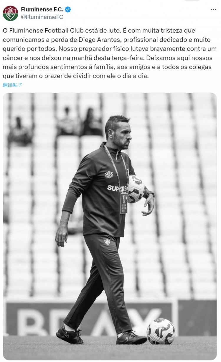 弗魯米嫩塞體能教練阿蘭特斯在本周二上午因癌癥離世,俱樂(lè)部官方社媒發(fā)文致哀:“弗魯米嫩塞足球俱樂(lè)部沉浸在悲痛之中,我們懷著無(wú)比沉重的心情宣布,迭戈-阿蘭特斯去世?!?/p>
