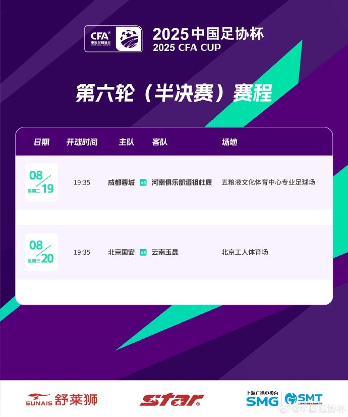 8月6日訊 官方消息,足協(xié)杯半決賽時(shí)間確定,兩場(chǎng)比賽分別8月19日以及20日進(jìn)行。