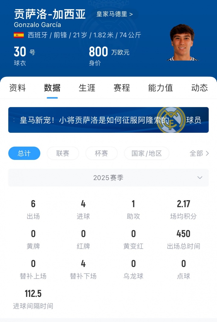 在今年2月份,貢薩洛在皇馬對(duì)陣萊加內(nèi)斯的國(guó)王杯1/4決賽比賽中替補(bǔ)登場(chǎng),并在93分鐘幫助球隊(duì)絕殺,也打入了自己的一線隊(duì)首球。24/25賽季,他大部分時(shí)間仍代表皇馬卡斯蒂利亞隊(duì)征戰(zhàn)西協(xié)甲。