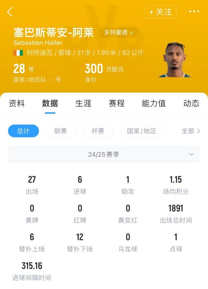 上賽季,阿萊為多特出場(chǎng)27場(chǎng),取得了6粒進(jìn)球和1次助攻,目前其德轉(zhuǎn)身價(jià)為300萬(wàn)歐。