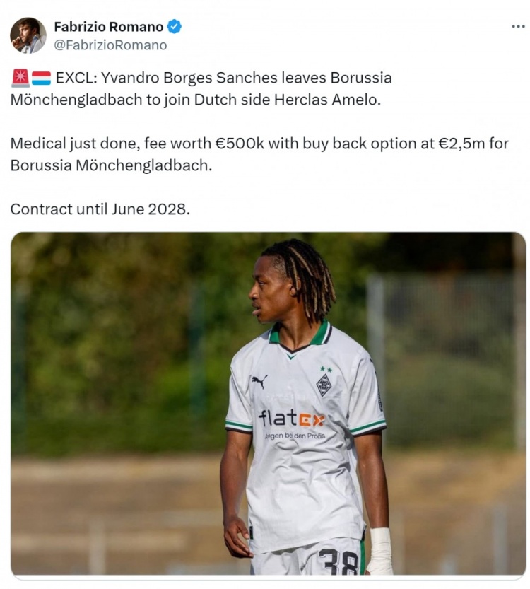 羅馬諾透露,門興小將桑切斯將加盟赫拉克勒斯,球員已經(jīng)完成體檢,轉(zhuǎn)會費(fèi)50萬歐元,協(xié)議中包含250萬歐元的回購條款,桑切斯將與赫拉克勒斯簽約至2028年6月份。