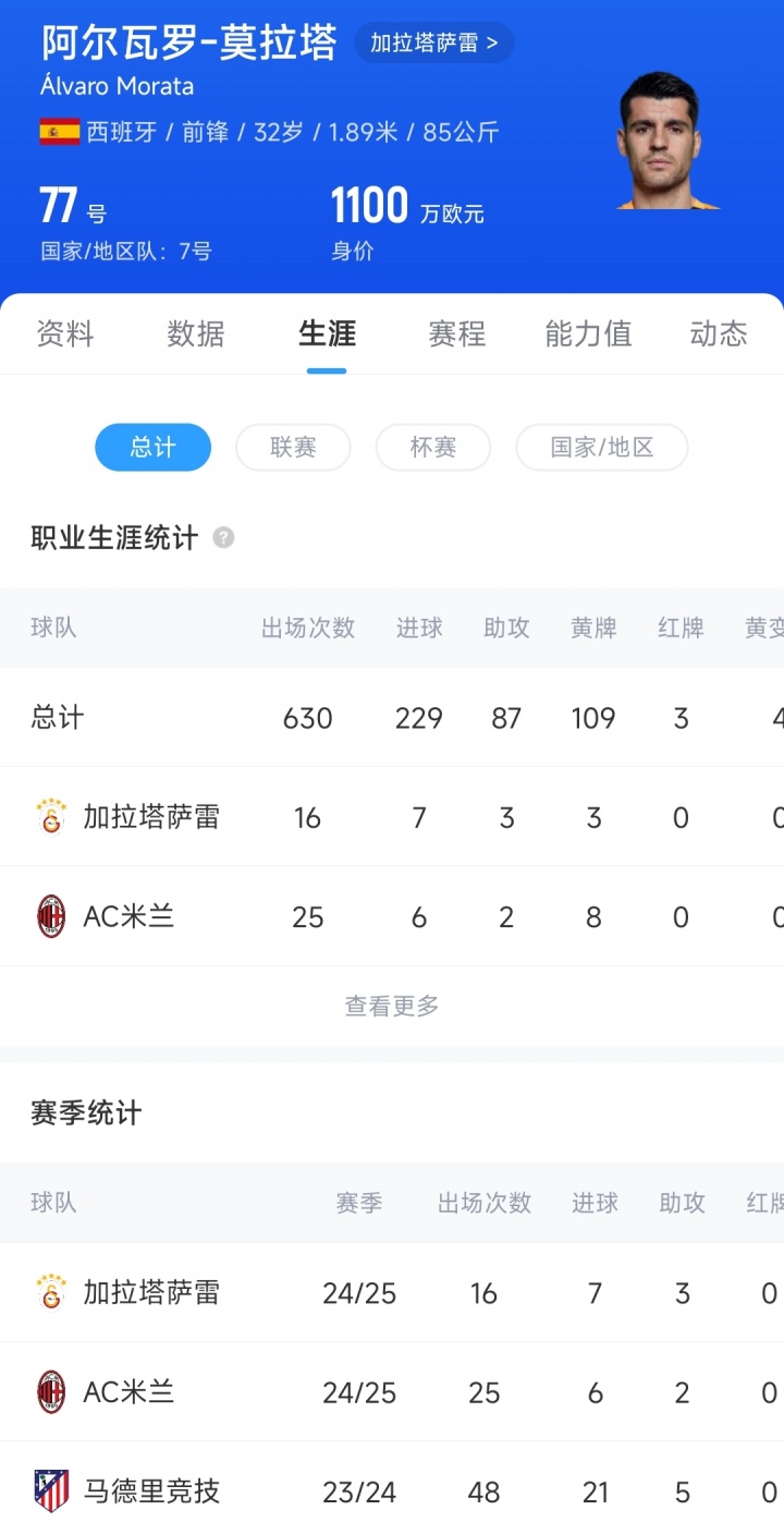 32歲的西班牙前鋒莫拉塔,上賽季被AC米蘭租借到加拉塔薩雷,共代表加拉塔薩雷出場16次,貢獻7粒進球和3次助攻。目前莫拉塔的德轉(zhuǎn)身價為1100萬歐。