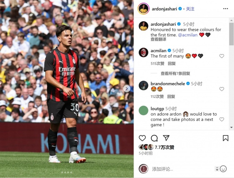 亞沙里更新社媒動態(tài),曬出比賽照片,配文:“很榮幸首次身披米蘭球衣參加比賽?!?/p>