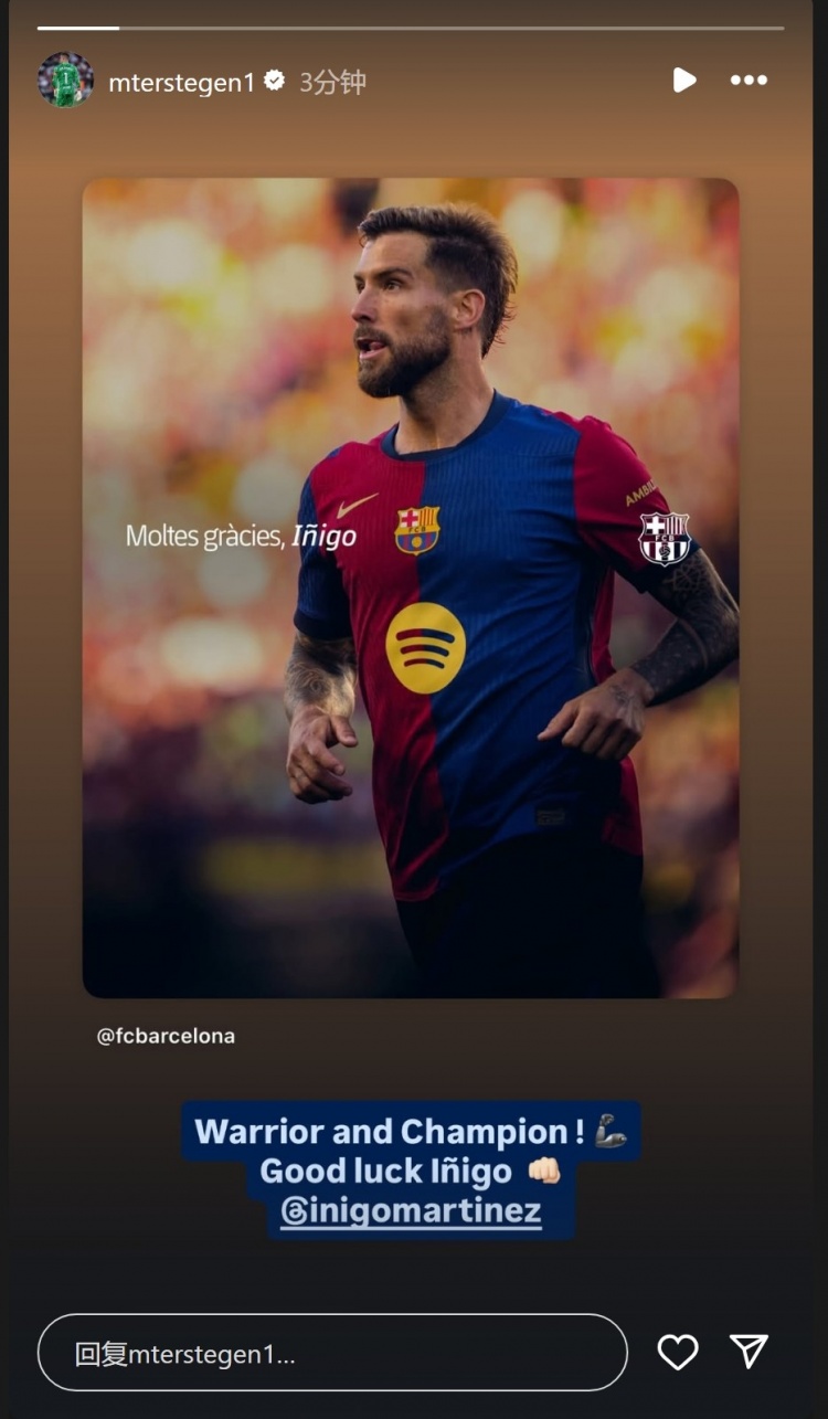 特爾施特根社媒轉(zhuǎn)發(fā)伊尼戈的海報,配文:“勇士與冠軍,祝你好運,伊尼戈!”