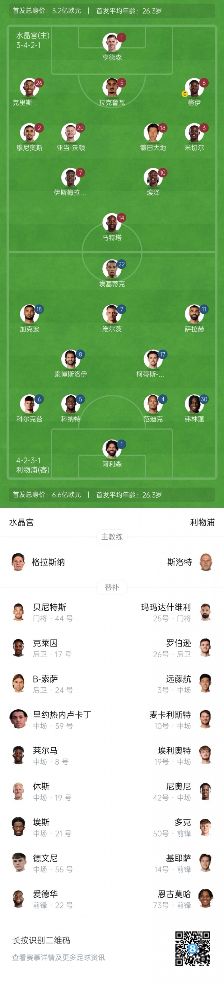 利物浦替補(bǔ):25-瑪瑪達(dá)什維利、3-遠(yuǎn)藤航、10-麥卡利斯特、14-基耶薩、19-埃利奧特、26-羅伯遜、42-尼奧尼、50-多克、73-恩古莫哈