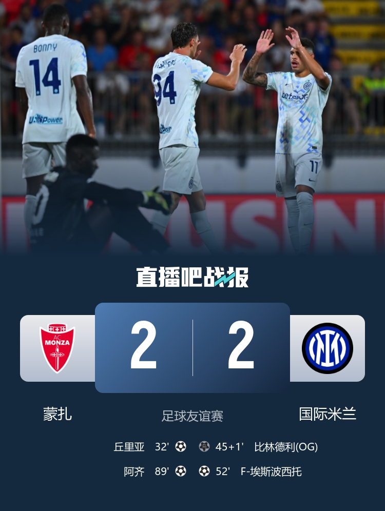 8月13日訊 北京時(shí)間8月13日凌晨3時(shí),國(guó)米在布里安特奧體育場(chǎng)與蒙扎進(jìn)行一場(chǎng)友誼賽。上半場(chǎng),丘里亞首開紀(jì)錄,隨后迪馬爾科制造了比林德利的烏龍球。國(guó)米半場(chǎng)1-1戰(zhàn)平蒙扎。下半場(chǎng),埃斯波西托破門反超,最后階段阿齊完成絕平。點(diǎn)球大戰(zhàn)中,國(guó)米7-5戰(zhàn)勝蒙扎。