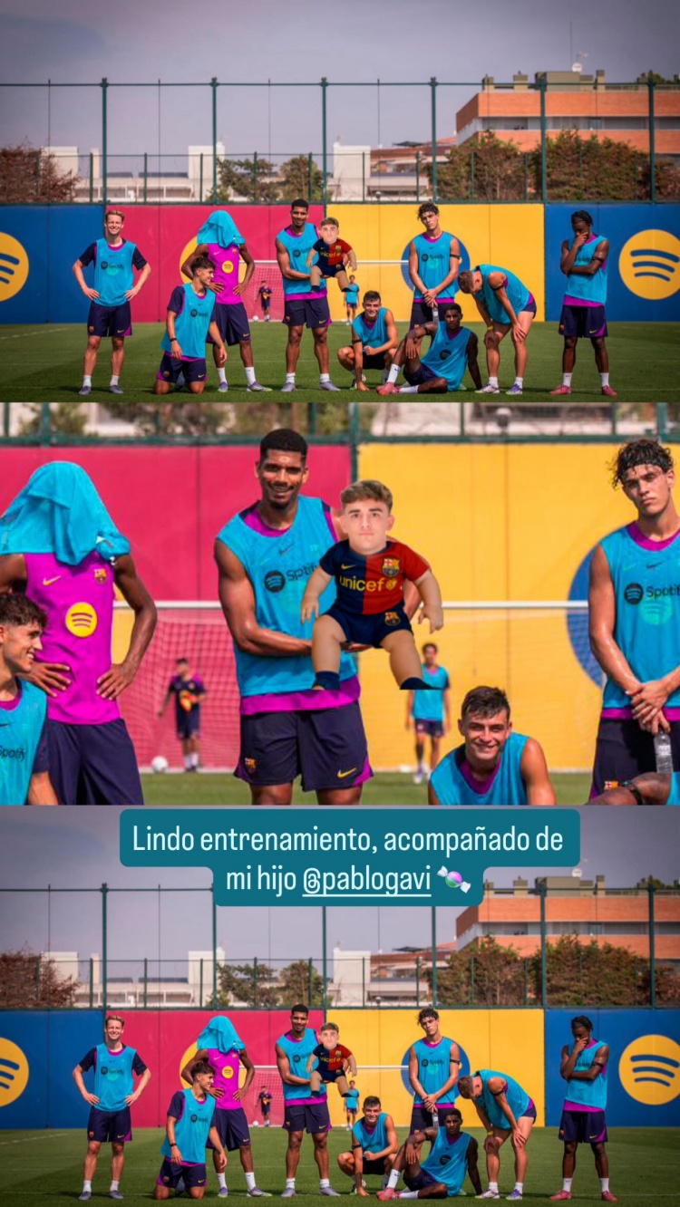 照片中,阿勞霍和隊(duì)友合影,手中P上了嬰兒加維,并寫道:“美好的訓(xùn)練時(shí)光,有兒子相伴左右?!?/p>