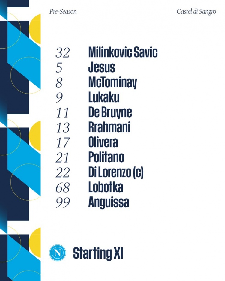 那不勒斯首發(fā):32-瓦尼亞-米林科維奇-薩維奇、5-胡安-熱蘇斯、8-麥克托米奈、9-盧卡庫、11-德布勞內(nèi)、13-拉赫馬尼、17-馬蒂亞斯-奧利維拉、21-波利塔諾、22-迪洛倫佐、68-洛博特卡、99-安古伊薩