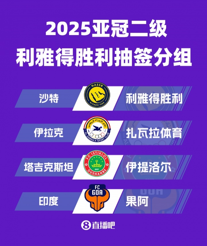 08月15日訊 25/26賽季亞冠二級聯(lián)賽小組賽抽簽,利雅得勝利為西亞區(qū)的一檔球隊,同組對手如下。