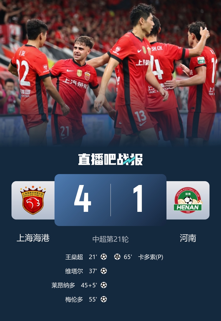 全場比賽結(jié)束,上海海港主場4-1戰(zhàn)勝河南。
