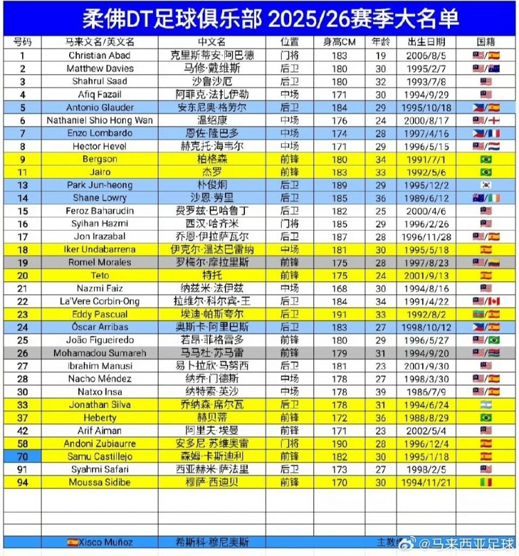 博主“馬來西亞足球”在社媒撰文,對柔佛新山陣容進行介紹,該博主表示: