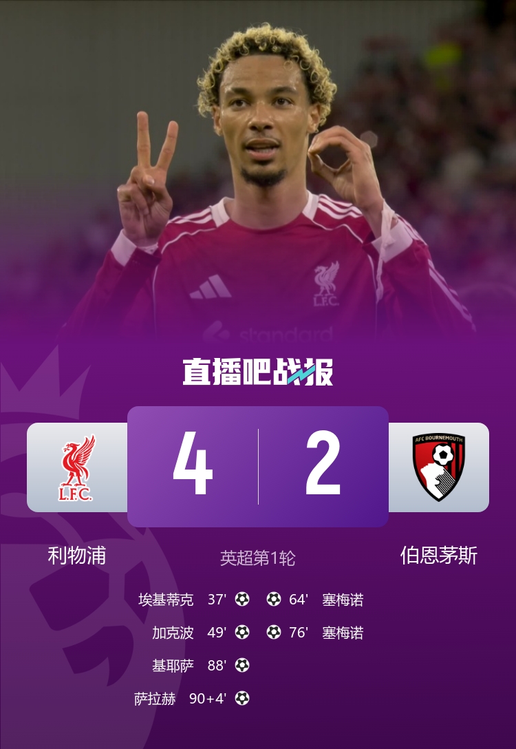 埃基蒂克傳射,小基耶薩替補(bǔ)絕殺,薩拉赫鎖定勝局。最終利物浦4-2伯恩茅斯收獲開門紅。