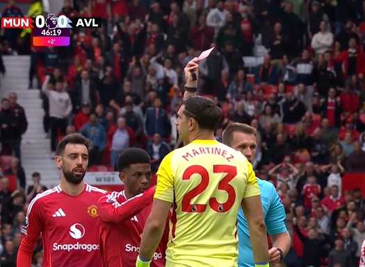 24/25賽季英超最后一輪,曼聯(lián)2-0十人維拉,上半場補時階段,卡什回傳送禮,大馬丁出擊踢翻單刀的霍伊倫,被主裁判直紅罰下。