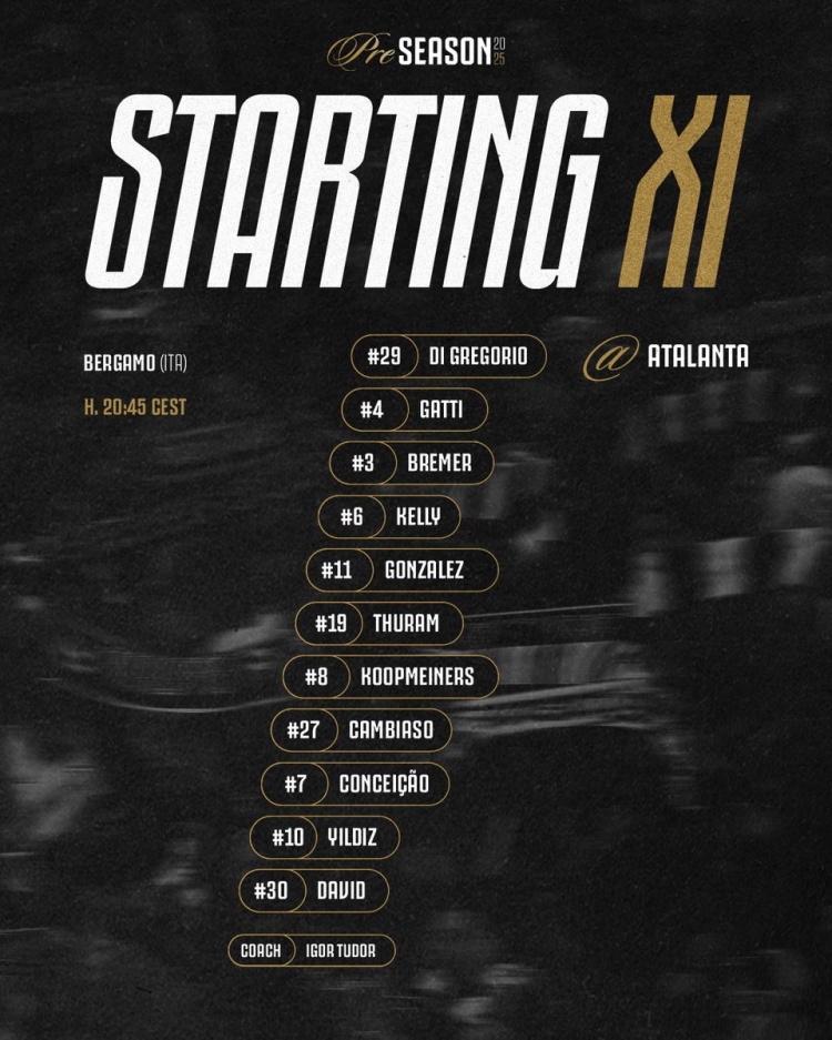 尤文首發(fā):29-迪格雷戈里奧、4-加蒂、3-布雷默、6-凱利、11-尼古拉斯-岡薩雷斯、19-凱夫倫-圖拉姆、8-庫普梅納斯、27-坎比亞索、7-小孔塞桑、10-伊爾迪茲、30-喬納森-戴維