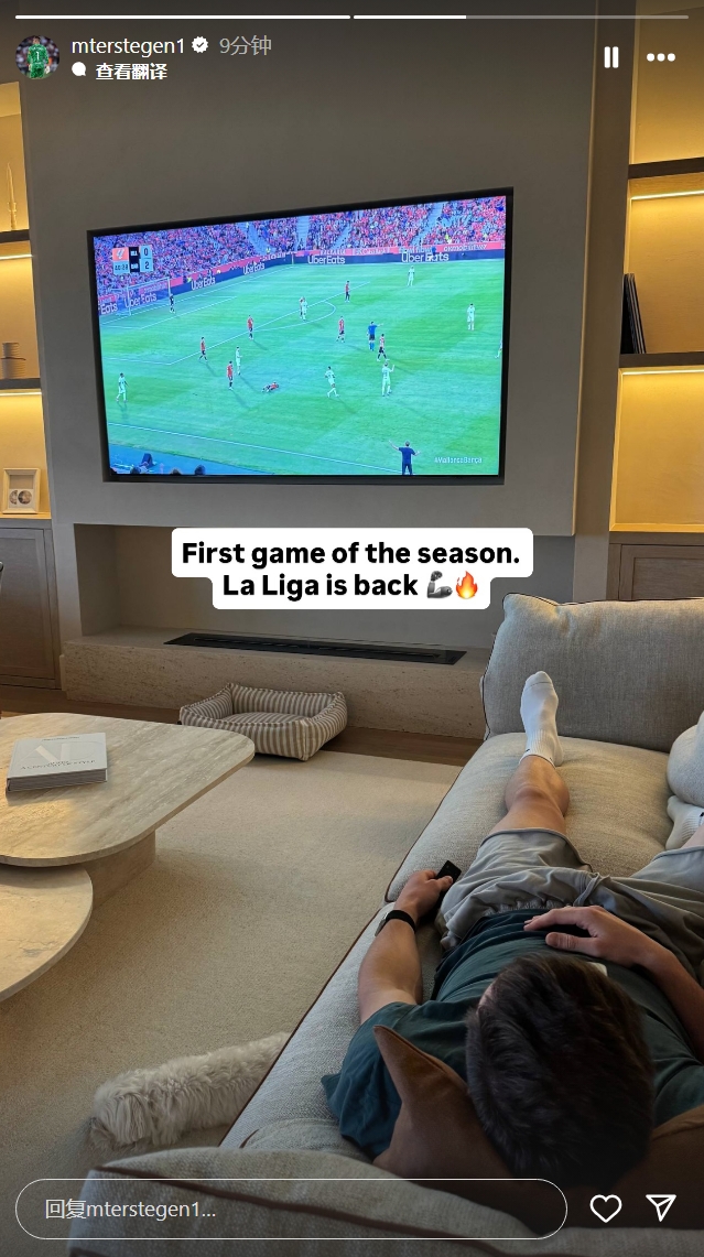 8月17日訊 巴薩門將特爾施特根更新社媒,曬照在家中觀看新賽季西甲首輪巴薩對馬洛卡。