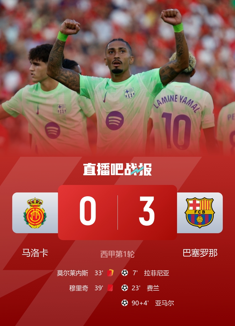 8月17日訊 北京時(shí)間8月17日1:30,西甲第1輪,巴塞羅那做客伊比利亞之星球場(chǎng)挑戰(zhàn)馬洛卡。上半場(chǎng),亞馬爾助攻拉菲尼亞頭槌先拔頭籌,費(fèi)蘭-托雷斯遠(yuǎn)射破門,莫爾萊內(nèi)斯兩黃變一紅被罰下,穆里奇危險(xiǎn)動(dòng)作被出示紅牌。下半場(chǎng),拉什福德替補(bǔ)首秀,奧爾莫中柱,補(bǔ)時(shí)階段亞馬爾破門鎖定勝局。最終,巴薩客場(chǎng)3-0擊敗馬洛卡,取得聯(lián)賽開門紅。