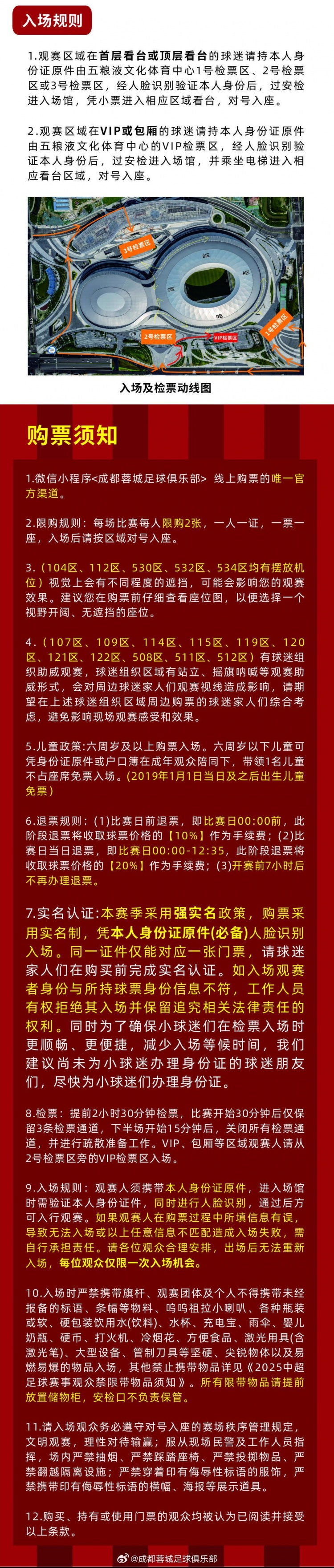 今日14:00,成都蓉城vs河南俱樂部酒祖杜康主場比賽球票線上開售,請各位球迷家人定好鬧鐘!線上購票相關(guān)購買須知、優(yōu)惠群體政策、進(jìn)場及檢票方式等信息請通過圖片詳情了解