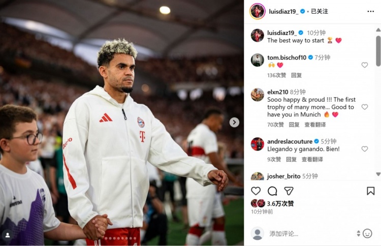 本場比賽新援路易斯-迪亞斯破門,打進(jìn)拜仁生涯首球,他也在個人社媒曬出本場入場時照片,配文寫道:“以最好的方式開啟新賽季
