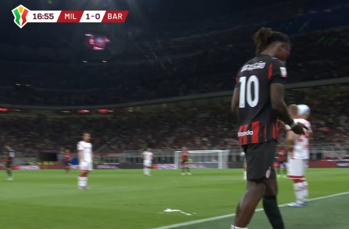 08月18日訊 意杯米蘭vs巴里,萊奧進(jìn)球后,第17分鐘萊奧受傷無法堅(jiān)持,圣地亞哥-希門尼斯登場。