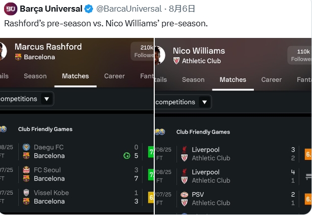 西班牙媒體eldesmarque報(bào)道,此前眾多網(wǎng)友在社媒批評(píng)尼科與畢爾巴鄂續(xù)約后的季前賽表現(xiàn),還有巴薩球迷號(hào)拿尼科與拉什福德季前賽表現(xiàn)對(duì)比。