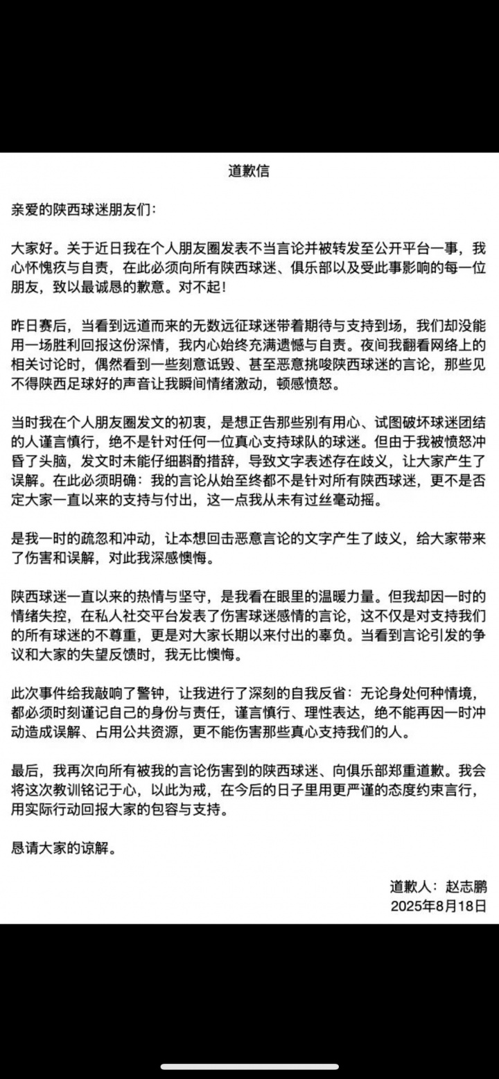 其個人道歉信內(nèi)容如下
