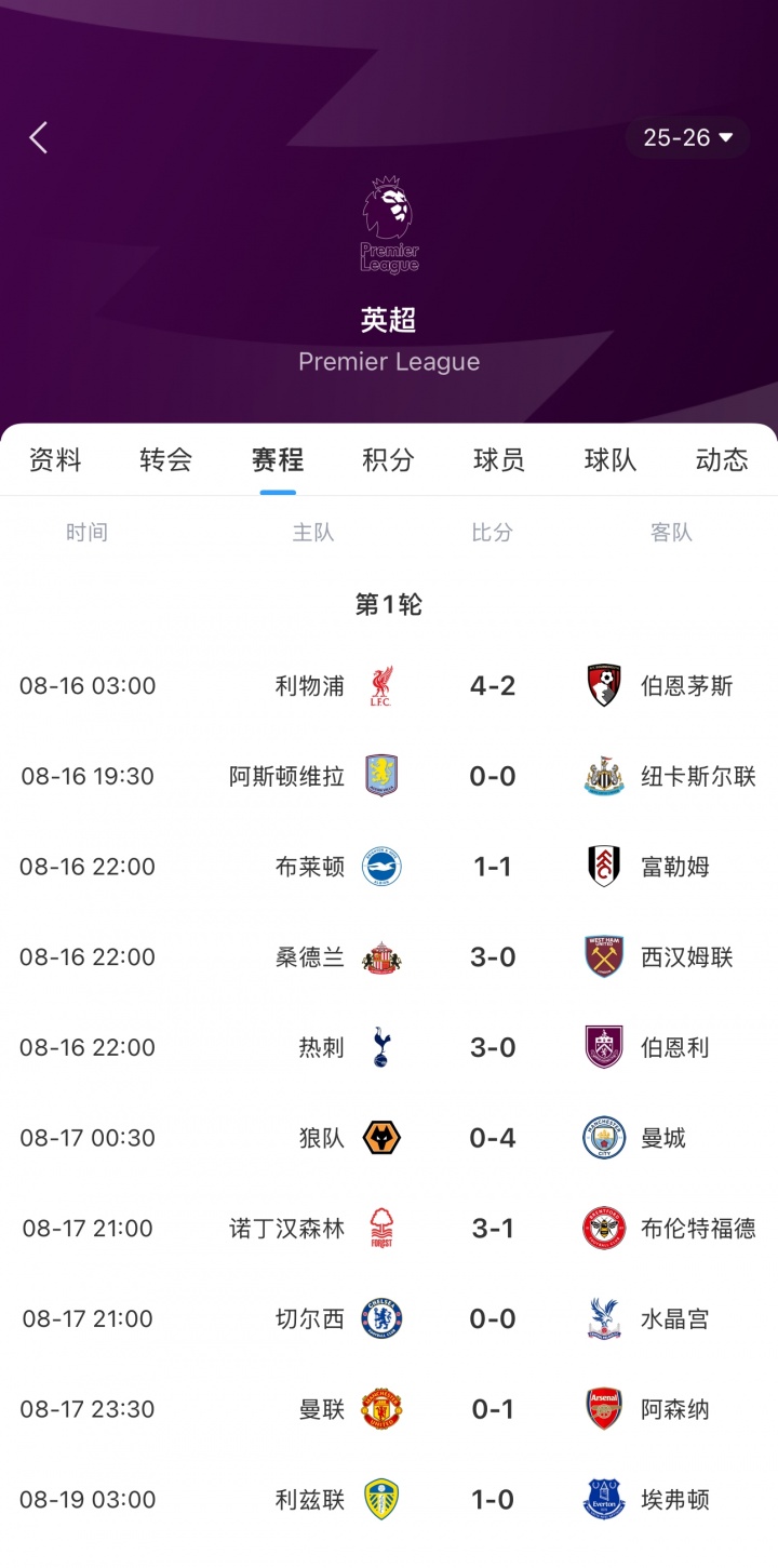 英超首輪賽果↓