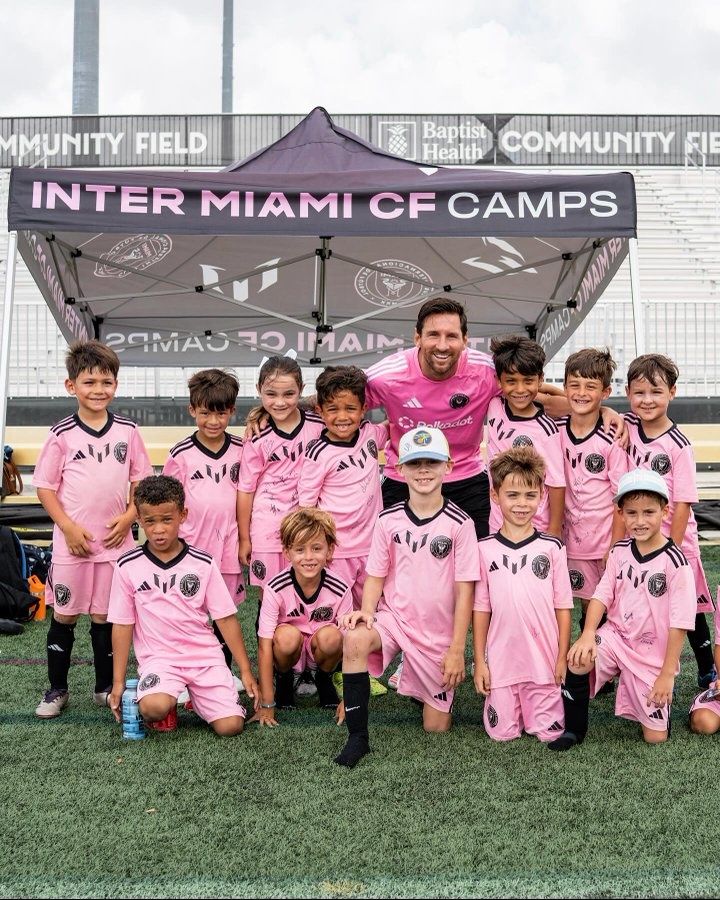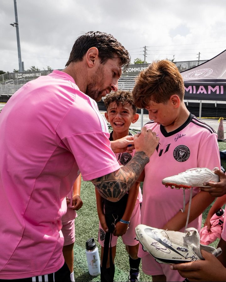 梅西出席邁阿密國際青訓學院的活動,與小球員互動,為他們簽名并合影。