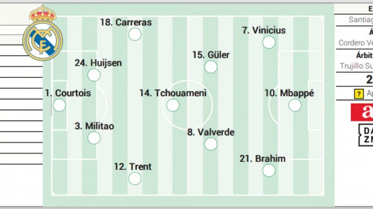 8月19日訊 西甲首輪,皇馬將在主場迎戰(zhàn)奧薩蘇納。賽前,西媒《阿斯報》預(yù)測了本場的首發(fā)名單,費(fèi)蘭-門迪、呂迪格(因國王杯決賽紅牌停賽)、卡馬文加、貝林厄姆和恩德里克缺陣,巴爾韋德回歸。