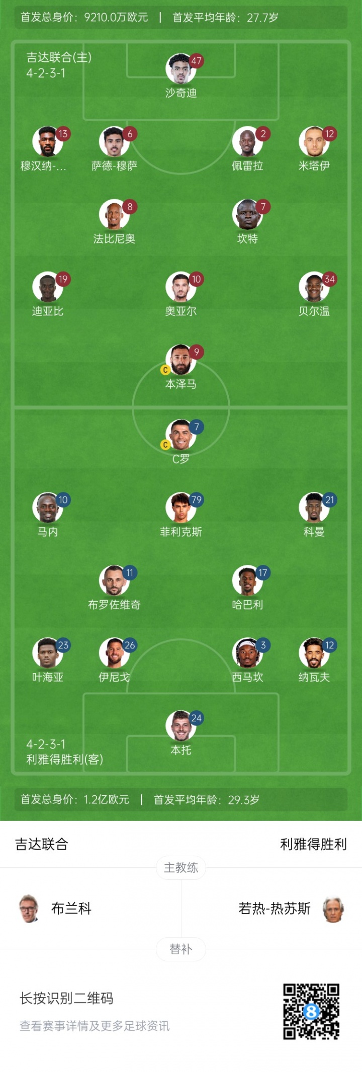 吉達(dá)聯(lián)合首發(fā):47-沙奇迪、12-米塔伊、2-佩雷拉、6-穆薩、13-尚基提、8-法比尼奧、7-坎特、10-奧亞爾、19-迪亞比、9-本澤馬、34-貝爾溫