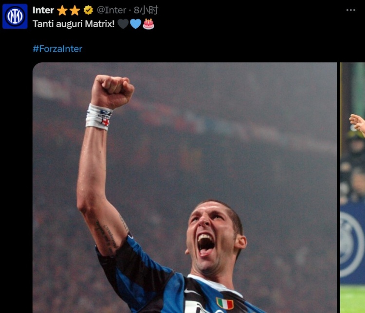 “馬特拉齊于1973年8月19日出生在萊切,今天,他迎來了自己52歲的生日,國際米蘭俱樂部以及所有藍(lán)黑球迷共同送上最誠摯的祝福?!?/p>