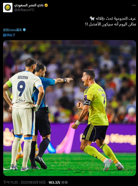 賽后,利雅得勝利官方賬號(hào)曬出C羅和本澤馬同框照片,并且配文:他在他的陰影下,知道了球星的特質(zhì)。所以他今天認(rèn)為自己是最好的?