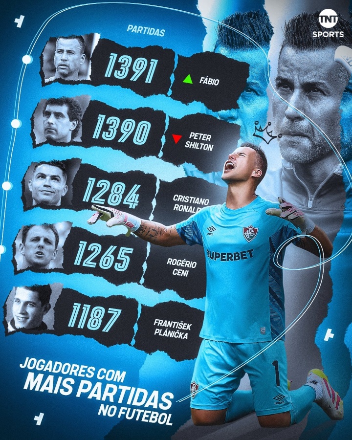 TNT Sports列足壇歷史出場數(shù)前五,44歲巴西門將法比奧居首,40歲C羅目前落后107場排第三,C羅是榜上唯一一名非門將球員。