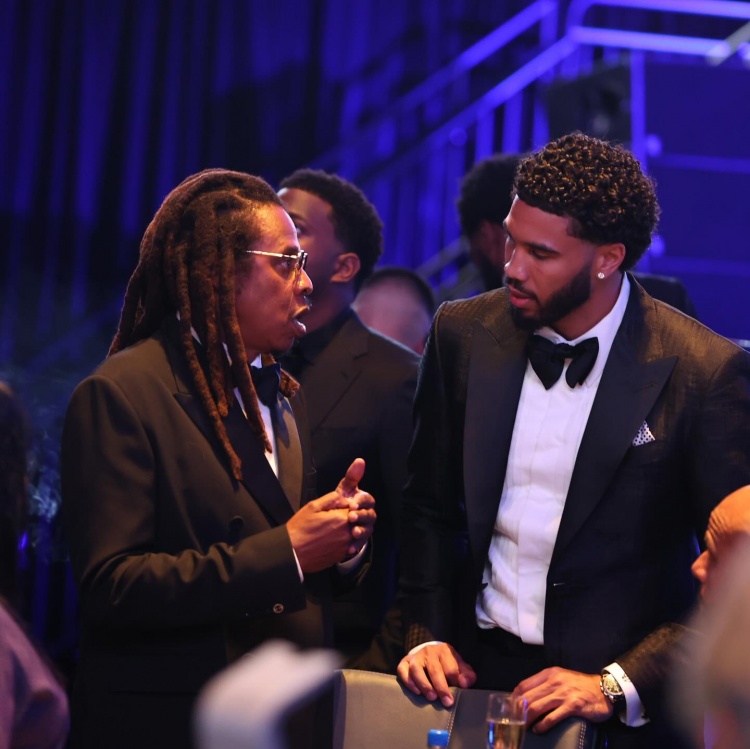 從照片中可以看到說(shuō)唱巨星Jay-Z、演員凱文-哈特、NFL球員奧戴爾-貝克漢姆、NBA球員唐斯、布克、哈利伯頓等人。