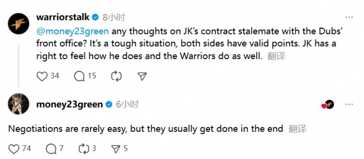 @warriorstalk詢問追夢對庫明加合同談判的看法:“對于庫明加和勇士的合同僵局,你有什么看法?這是一個(gè)艱難的局面,雙方都有合理之處。庫明加有權(quán)利表達(dá)自己的感受,勇士也一樣?!?/p>