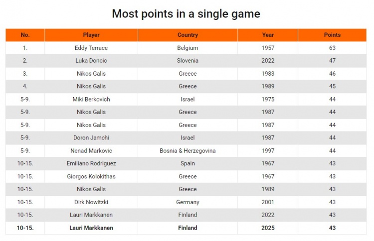 這是馬爾卡寧第二次在歐錦賽上砍下43分,43分的得分在歐錦賽歷史單場得分榜上并列第10。諾維茨基、尼科斯-加里斯、喬治斯-科洛基塔斯、埃米利亞諾-羅德里格斯也有過單場43分的表現(xiàn)。