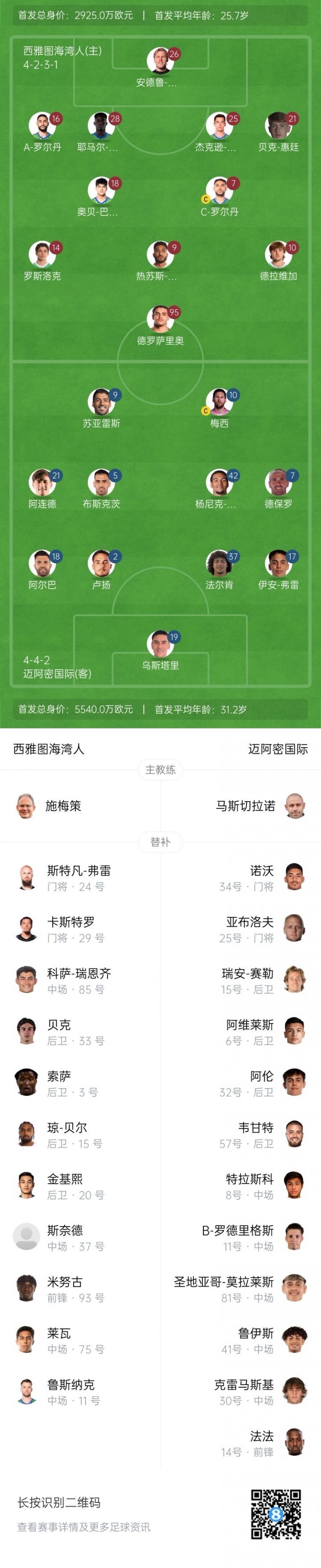 09月01日訊 聯(lián)盟杯決賽,西雅圖海灣人對(duì)陣邁阿密?chē)?guó)際,賽前首發(fā)公布。