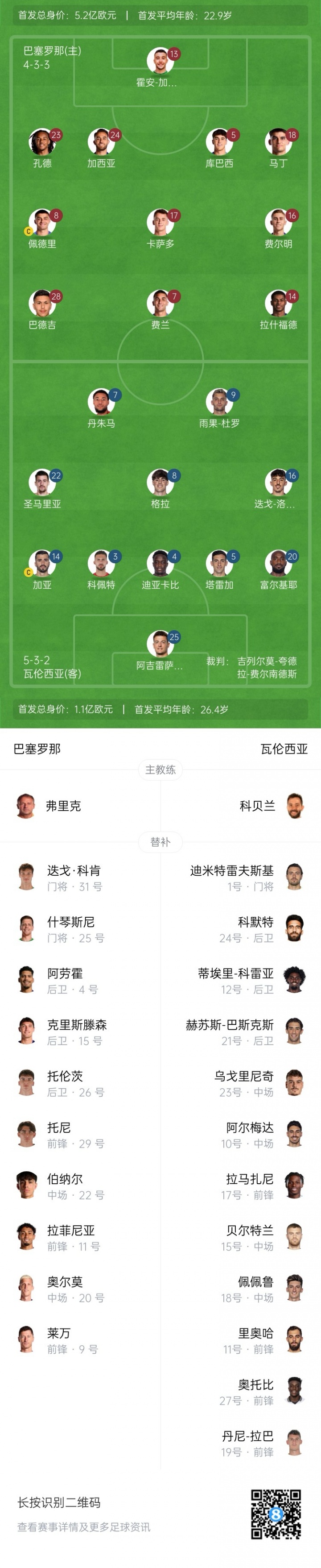 瓦倫西亞首發(fā):25-阿吉雷薩巴拉、20-富爾基耶、5-塔雷加、4-迪亞卡比、3-科佩特、14-加亞、22-圣馬里亞、8-格拉、16-迭戈·洛佩斯、7-丹朱馬、9-雨果·杜羅