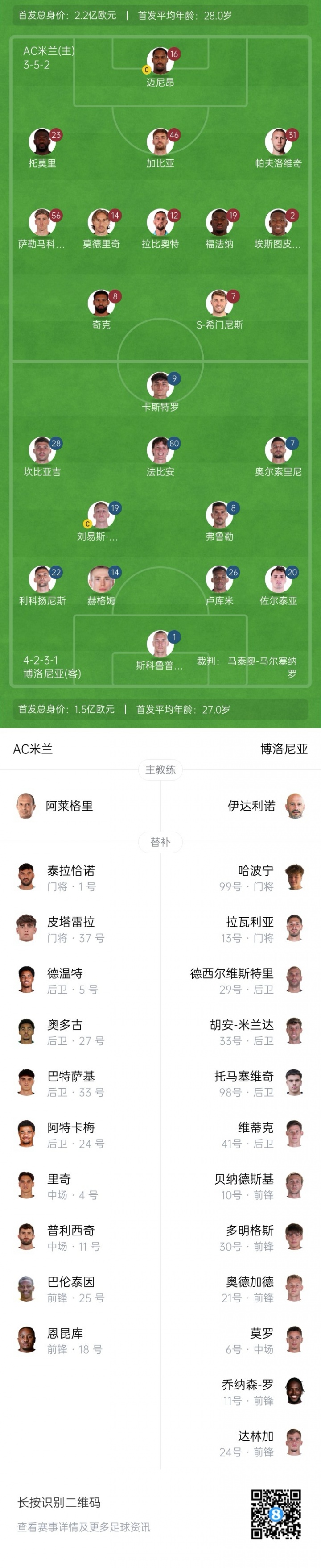 博洛尼亞替補(bǔ):99-哈波寧、13-拉瓦利亞、29-德西爾維斯特里、33-胡安·米蘭達(dá)、41-維蒂克、98-托馬塞維奇、6-莫羅、11-喬納森·羅、21-奧德加德、24-達(dá)林加、10-貝納德斯基、30-本哈明·多明戈斯