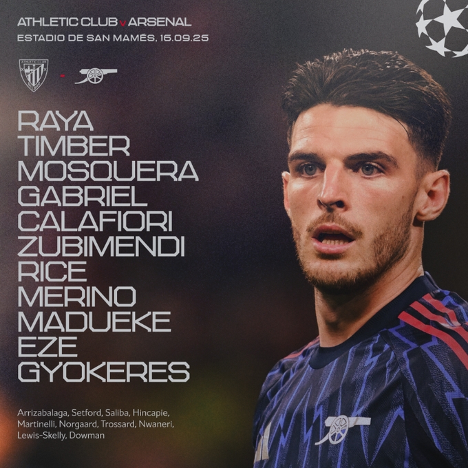 09月16日訊 歐冠聯(lián)賽階段第1輪,畢爾巴鄂競技主場迎戰(zhàn)阿森納,賽前首發(fā)名單公布。本場比賽厄德高、薩卡、哈弗茨、本-懷特因傷缺戰(zhàn),新援約克雷斯、埃澤、馬杜埃凱出戰(zhàn),薩利巴回歸坐鎮(zhèn)替補(bǔ)。