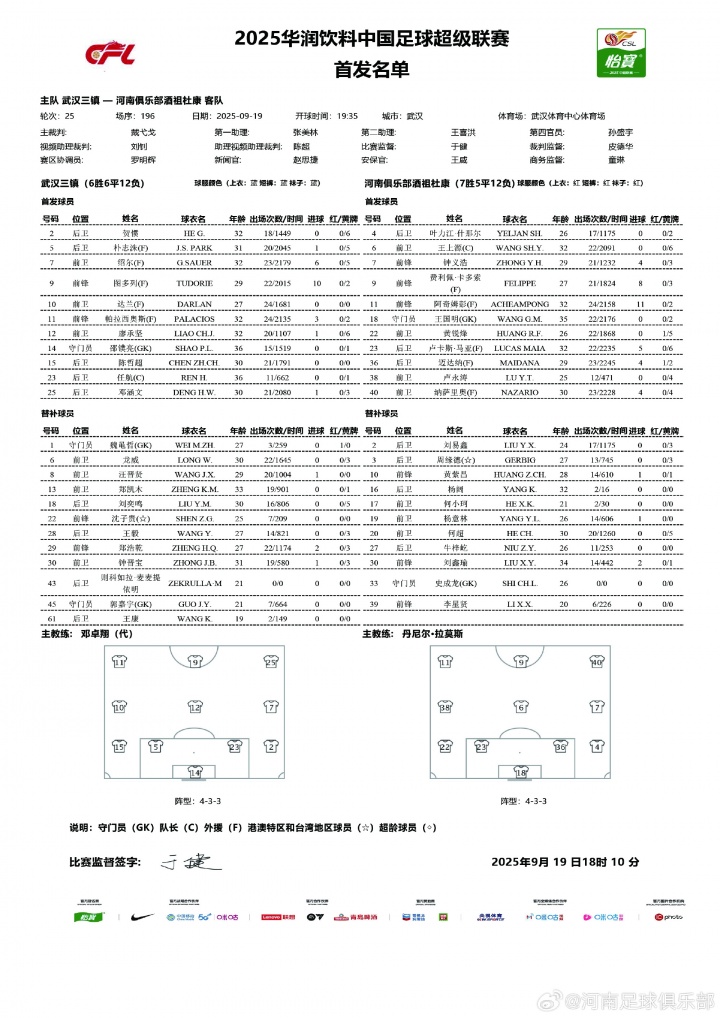 武漢三鎮(zhèn)VS河南俱樂部酒祖杜康 首發(fā)及替補隊員名單