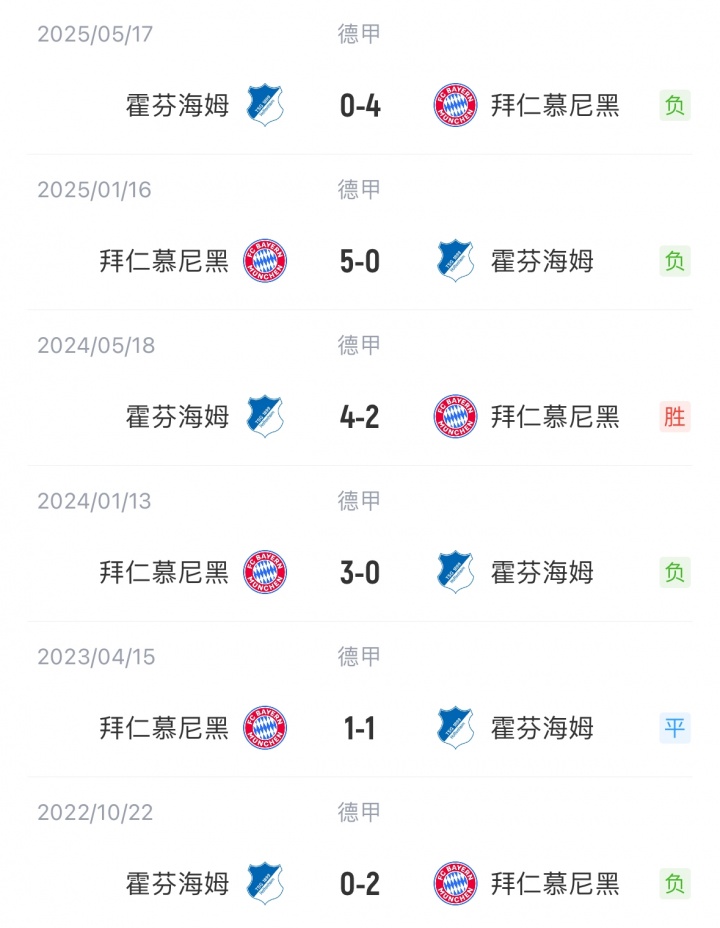 拜仁德甲3連勝積9分位列榜首;霍芬海姆2勝1負(fù)暫列德甲第6。