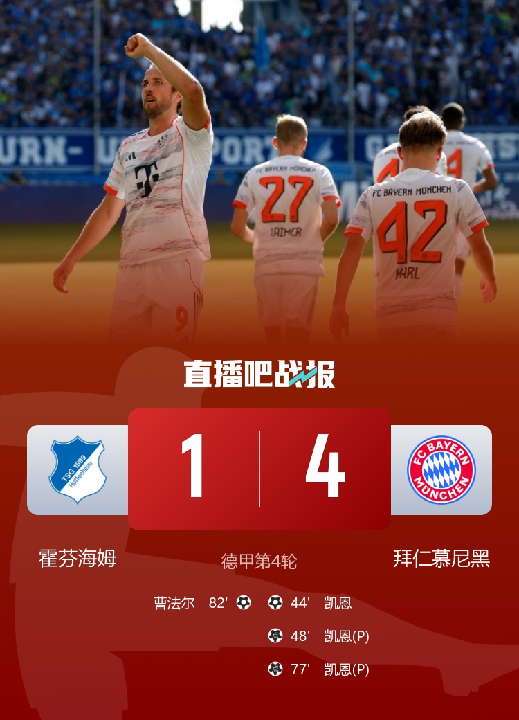 全場比賽結(jié)束,最終拜仁4-1霍芬海姆。