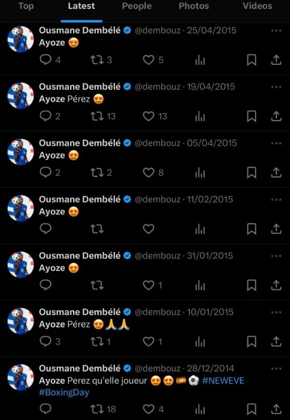 這些推文顯示,現(xiàn)效力于比利亞雷亞爾的阿約澤-佩雷斯曾是登貝萊的偶像之一。